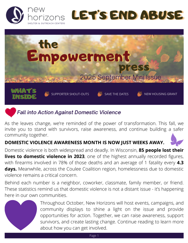 New Horizons Shelter and Outreach Centers support victims of abuse and create a safe community for all through education, advocacy, empowerment, and collaboration.